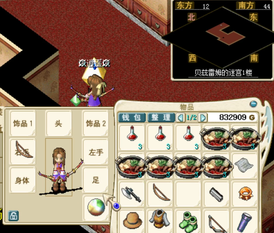 其实超过2人一队的话,在贝兹雷姆宫殿是禁忌 , 大地翼龙 会随机使用 装备破坏 来惩罚你, 大炸弹 会使用 自爆 来报复你。但是5人成行的队伍拆成2人一队也是麻烦。 因此我们就 卸下所有装备 ,只装备 水晶 和提前准备好的 平民武器 ,这里使用便宜的平民弓,既可以稍微增加攻击力也不耽误我们使用乱射清小怪。