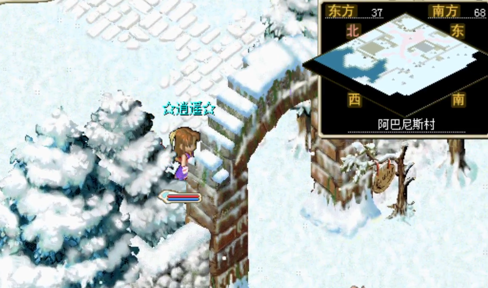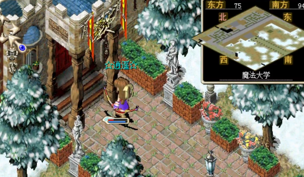 出村口一路往 西北方向走 ,看到小地图上出现没有白雪覆盖的入口,就到达了 魔法大学 的门口。