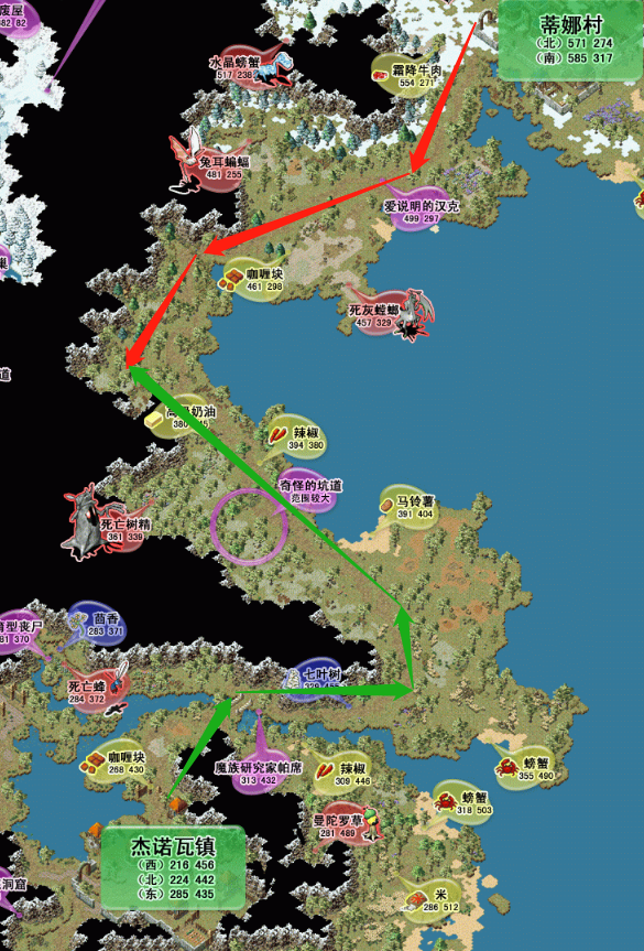 红色为蒂娜路线,绿色为杰诺瓦路线