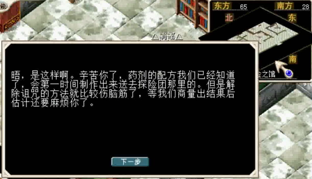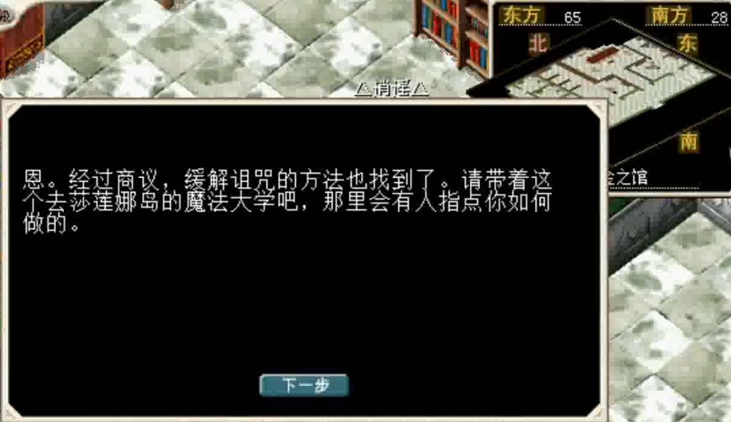 下到 1楼 ,前往 房间<22,5> 与 书库管理员<80,70> 对话下楼。