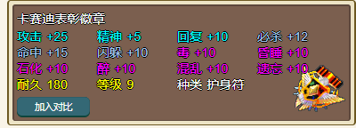 ◆ 【卡赛迪表彰徽章】:Lv.9护身符、耐久180;攻击+25、精神+5、回复+10、抗毒/昏睡/石化/酒醉/混乱/遗忘+10、必杀+12、命中+15、闪躲+10、抗魔+30;明镜止水耗魔减少50%