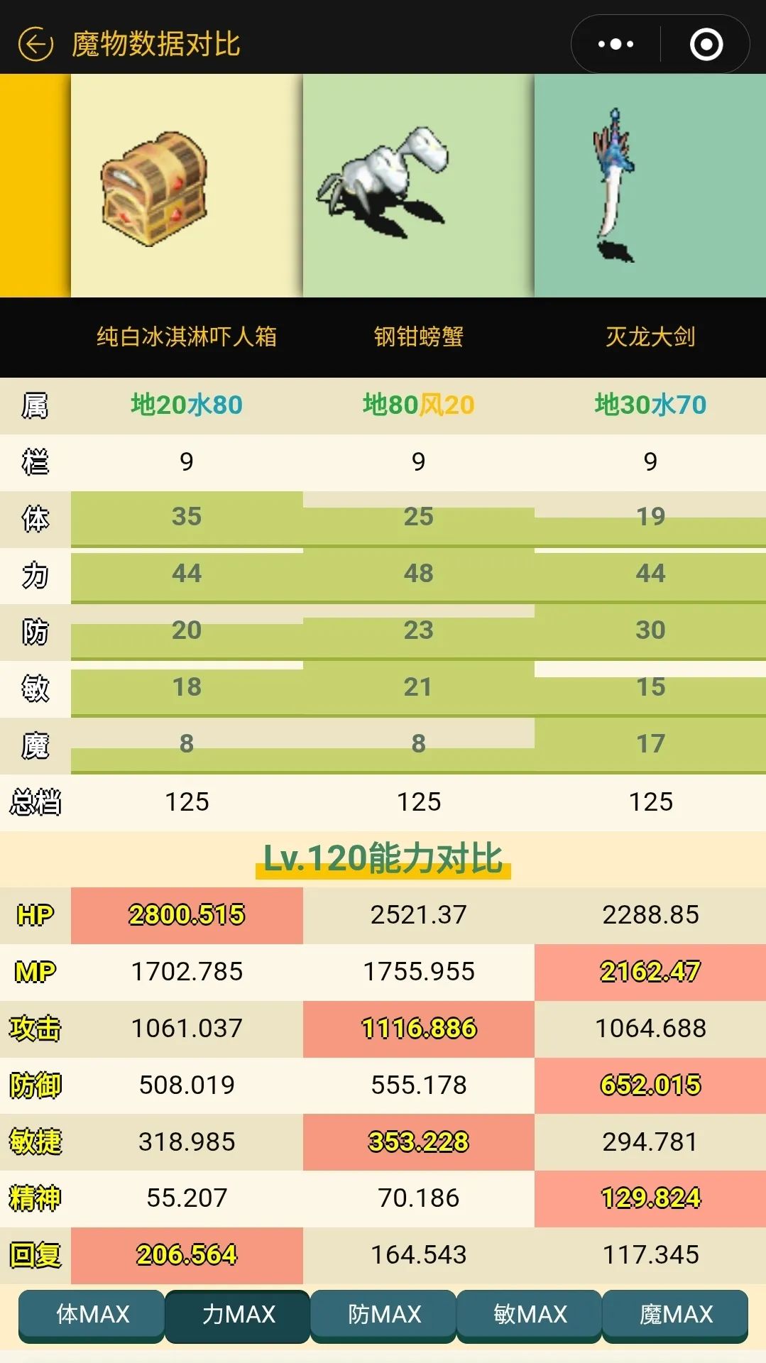 下一组我们对比同属金属系的 纯白冰淇淋 和 钢钳螃蟹 。除了图中显示的数值对比,大剑和螃蟹分别具有 3点和5点的命中 修正。很显然,冰淇淋依旧以其优雅的血统在均衡性上碾压新出道的灭龙大剑。而钢钳螃蟹则拥有优秀的攻击力和敏捷,以及命中修正。另外属性上的纯度上前两者也占尽优势。