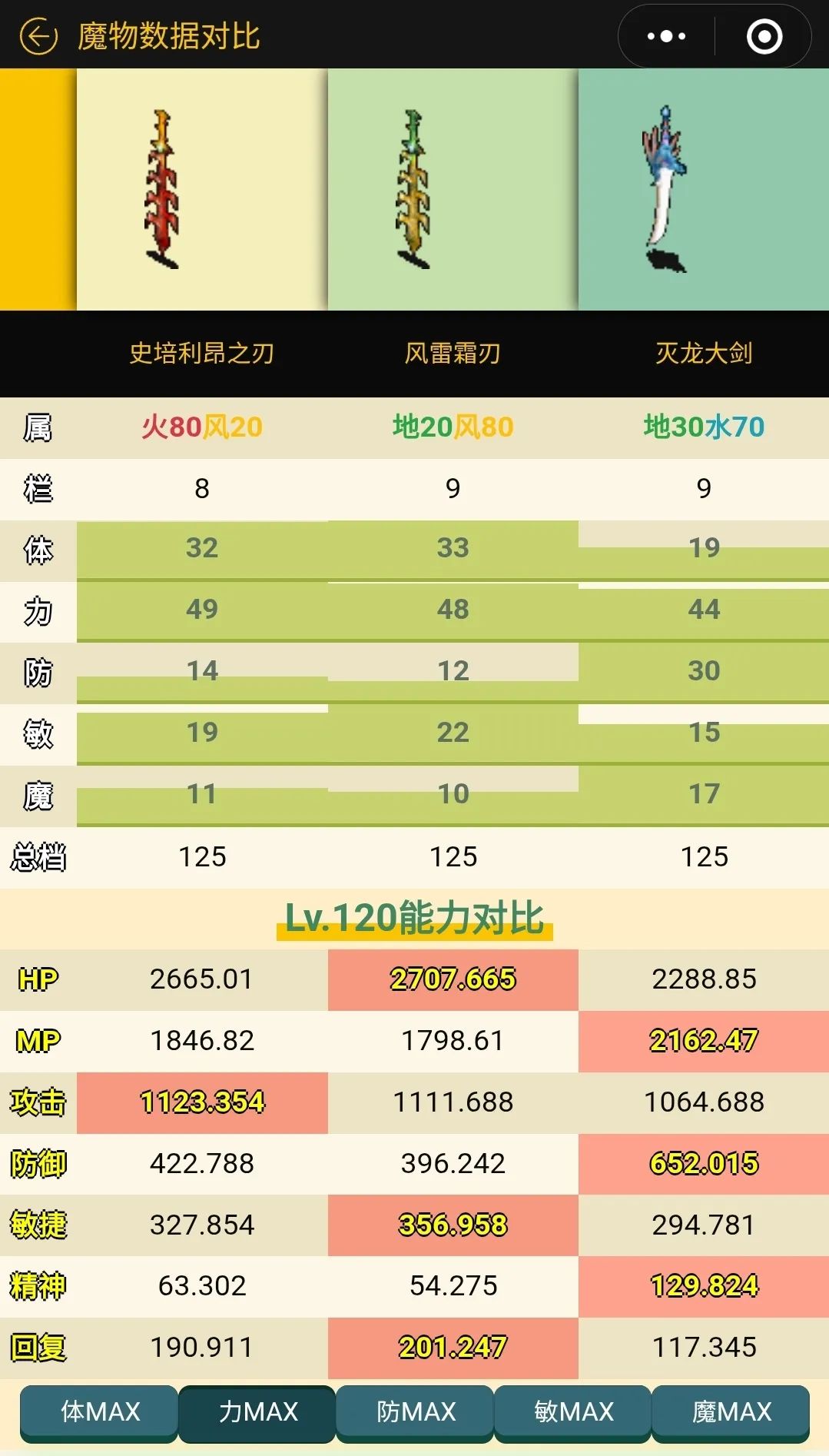 跑题了哈哈,下面看一下改刀御三家的对比图吧。抛开体力、攻击力以及敏捷等主流指标不看,那么恭喜各位迎来史上 最硬的且精神最高 的改造刀——灭龙大剑。( 水龙蜥:这次都不用老子出场了…… )